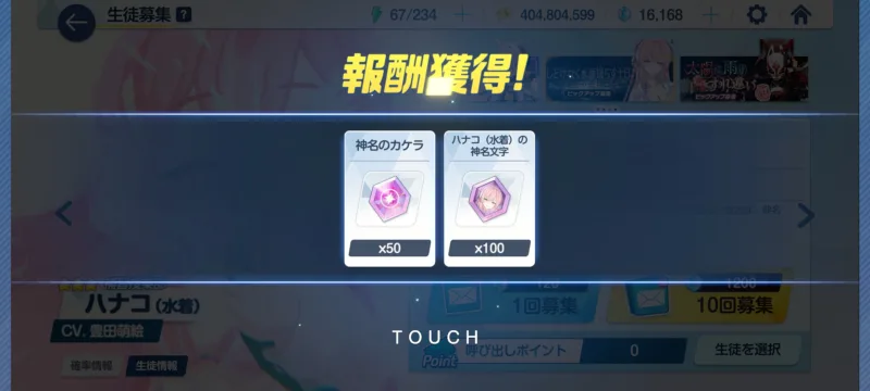 水着ハナコ、ココナ、水着ヒフミ、水着ハナコ2回目、水着タマモ、水着ノゾミの計6名で期待値通り6%続いて後半。